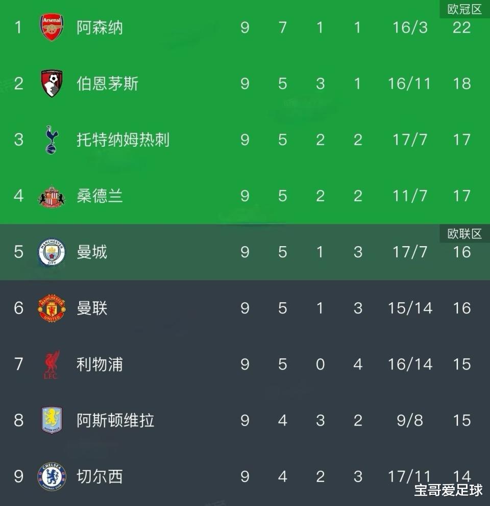 英超第9轮结束后,看看现在积分榜上的排名,有种恍如隔世的感觉,英超大变天了!千年老二阿森纳目前高居榜首遥遥领先,领先老对手曼城、利物浦和曼联至少两个胜场;英超BIG6的其余5支球队热刺、曼城、曼联、利物浦和切尔西中只有热刺杀进了前四通联随配,但也足足落后阿森纳5分!夏窗卖光后防线的伯恩茅斯和升班马桑德兰都进入了前四,这还是我们熟悉的英超吗?