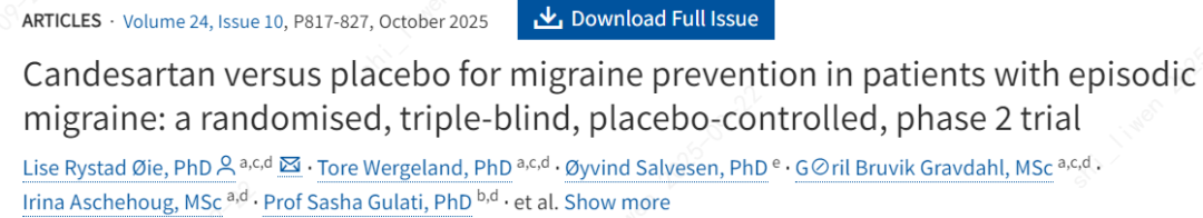 [1] Lise Rystad Øie, et al., (2025). Candesartan versus placebo for migraine prevention in patients with episodic migraine: a randomised, triple-blind, placebo-controlled, phase 2 trial. The Lancet Neurology, DOI: 10.1016/S1474-4422(25)00269-8